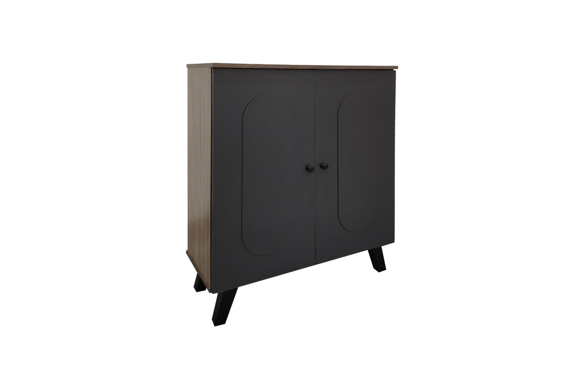Η κομψή παπουτσοθήκη Cathi συνδυάζει μοντέρνο design με πρακτική λειτουργικότητα. Διαθέτει δύο πόρτες με χαρακτηριστικά οβάλ σχήματα και διακριτικά στρογγυλά χερούλια, προσδίδοντας μια παιχνιδιάρικη αλλά εκλεπτυσμένη αισθητική στον χώρο σας. Το εσωτερικό της προσφέρει αποθηκευτικό χώρο για την τακτοποίηση των υποδημάτων σας. Η χρωματική αντίθεση δημιουργεί ένα ευχάριστο οπτικό ενδιαφέρον. Στηρίζεται σε τέσσερα πόδια σε μαύρο χρώμα που ενισχύουν το μοντέρνο στυλ και προσφέρουν σταθερότητα.