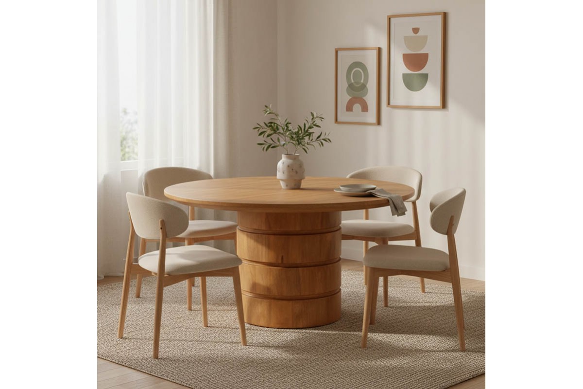 Διαχρονική Γοητεία: Η στρογγυλή επιφάνεια από φυσικό ξύλο, με το απαλό φινίρισμα, δημιουργεί μια φιλόξενη ατμόσφαιρα. Είναι το ιδανικό σκηνικό για τα γεύματά σας, τις συζητήσεις με αγαπημένα πρόσωπα ή ακόμα και για στιγμές χαλάρωσης με ένα βιβλίο.