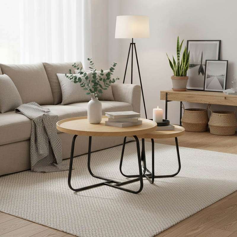 Tραπέζια σαλονιού Crismory pakoworld σετ 2τεμ MDF σε φυσική απόχρωση και μαύρα μεταλλικά πόδια