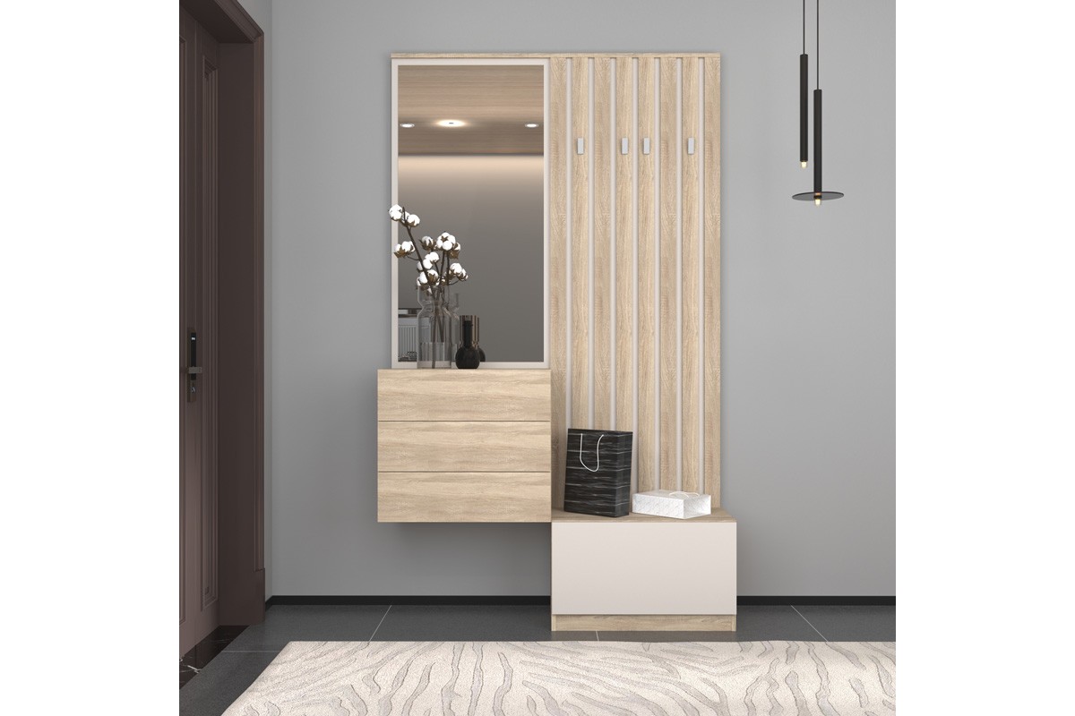Συνδυάζει καθρέφτη, κρεμάστρα και αποθηκευτικό χώρο, προσφέροντας πρακτικές λύσεις για οργάνωση.