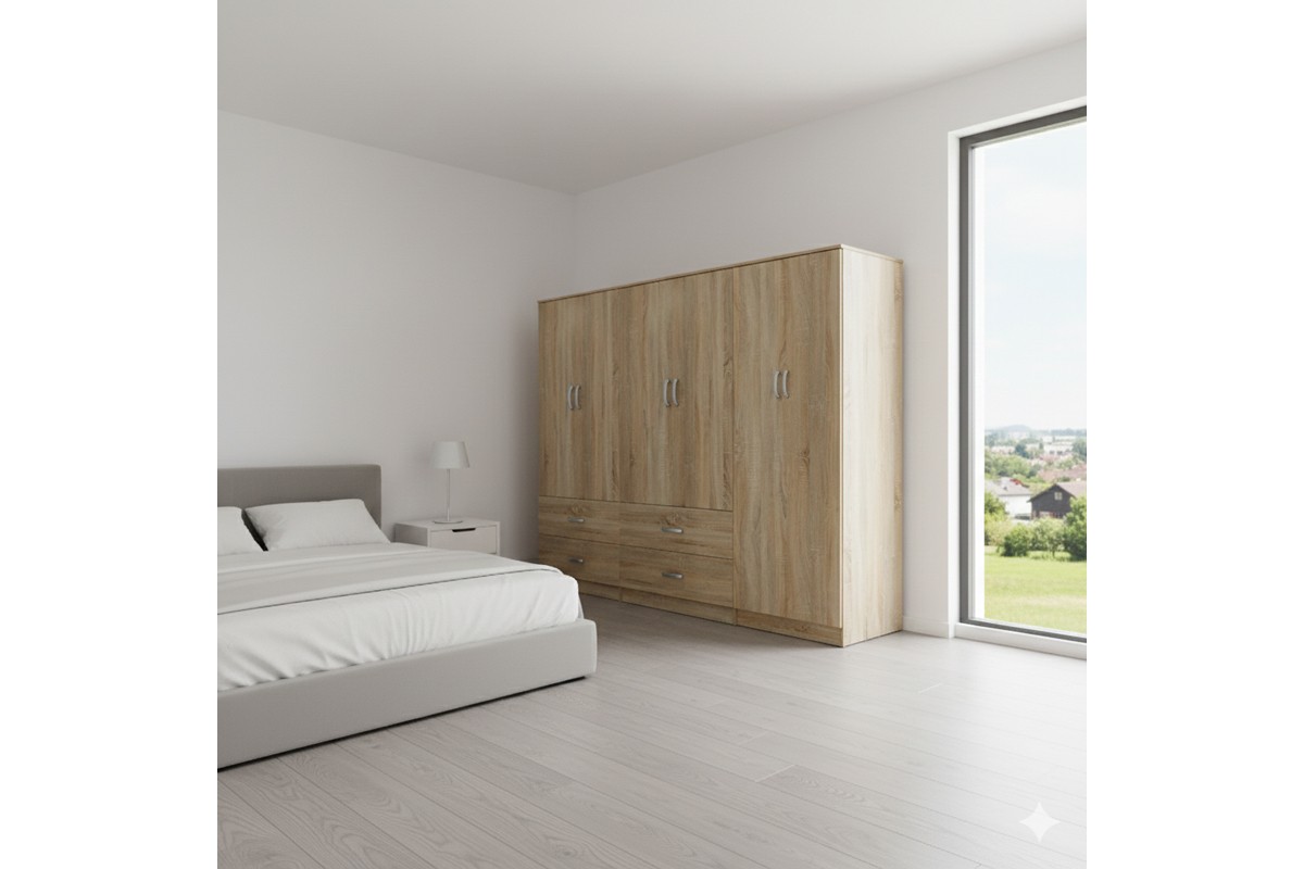 Περιλαμβάνει εξι πόρτες, εσωτερικά φέρει ράγα για κρεμάστρες ενώ κάτω φέρει τεσσερα μεγάλα συρτάρια για την αποθήκευση ρούχων και αξεσουάρ.