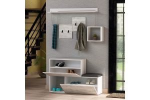 * Περιλαμβάνει δύο κλειστά ντουλάπια για παπούτσια, ράφια / κουτιά για διακοσμητικά, κρεμάστρες για ρούχα και ένα αναπαυτικό μαξιλάρι καθίσματος σε χρώμα μαύρο στην μία άκρη για χρήση ως σκαμπό.